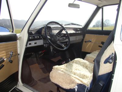 So dann war Zeit für eine kurze Pause (Aber Herr Müller, legen sie ruhig die Füße hoch ... ) um dann zunächst den Hänger abzukoppeln und mit dem Bulli in eine Schrebergarten Anlage zu fahren. Hier lagerten schon seit Jahren die Überreste eine zerlegten DAF 44. Sowie wir diese verstaut hatten, und wieder vor Ort waren, war erst mal Kaffeezeit. Nach Kaffee und Kuchen wurden wir dann in die Tiefgarage geführt um das Schätzchen in Augenschein zu nehmen. Was hier im Untergrund einer Münchener Hochhauswohnsiedlung schlummerte erfüllte all meine Hoffnungen vollends. Der Wagen stand da wie neu, frisch poliert, Inspektionsliste abgearbeitet, perfekt. Zwar nicht 100% original, so wurde eine Polstergarnitur eines Volvo 66 montiert, was der Sache aber keinen Abbruch tut. Viele andere kleine herrliche Details runden das Bild ab, und man merkt das an diesem Wagen ausschließlich mit Sachverstand im höchsten maase gearbeitet wurde. Der rüstige Herr schmiß dermaßen mit Fachwissen um sich, das sogar mir mehr als einmal die Worte fehlten, und man merkte sichtlich das ihm das gehörigen Spaß machte. Sollte also mal jemand ein Problem mit seinem 44 haben und nicht ein noch aus wissen, stelle ich gern den Kontakt her !