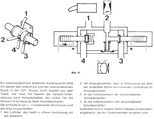 Beim Anfahren sitzen die Riemen vorne ganz innen und hinten ganz aussen. Das ist die Anfahrübersetzung. wenn jetzt losgefahren wird, drücken die Fliehgewichte die vorderen Scheiben nach innen ,der Riemen wandert vorne nach aussen und hinten gegen den Federdruck nach innen. die Übersetzung ändert sich damit durch Veränderung der Riemenscheibendurchmesser. Die Fliehgewichte schalten drehzahlabhängig und werden durch die Vakuummembranen in der Primär unterstützt. Ab 1800 umin bei Fzgen mit Tachorelais oder wenn der Mikroschalter bei den anderen schaltet, werden die Fliehgewichte vom Vakuum unterstützt, damit er schneller hochschalstet .Das schalten geht über das Vierwegeventil, das Fahr-und Bremskammer schaltet .Die Fahrkammerseite begrenzt das Vakuum dann auf 0,4 bar, damit die Membranen nicht überdehnt werden. Deshalb beim beschleunigen bei ca 50 kmh das gas kurz wegnehmen, damit genug Vakuum zum hochschalten da ist .Wenn man bremst, Kickdown gibt oder die Bergbremse betätigt, wird die Fahrkammer belüftet und die Bremskammer schaltet ein. Die CVT schaltet dann bildlich einen gang runter. mit jeder der drei Vorgänge wird die Masse der Fahrkammer weggenommen und die Bremskammer eingeschaltet. Die letzte Ausführung des 340 hat einen Hochdruckschalter am Hauptbremszylinder. Der Schalter unterbricht, wenn die bremse getreten wird und schaltet über die Bremskammer runter, damit die Riemen beim anfahren wieder in der kürzesten Übersetzung sind. Dies gilt auch für die alten DAFs.