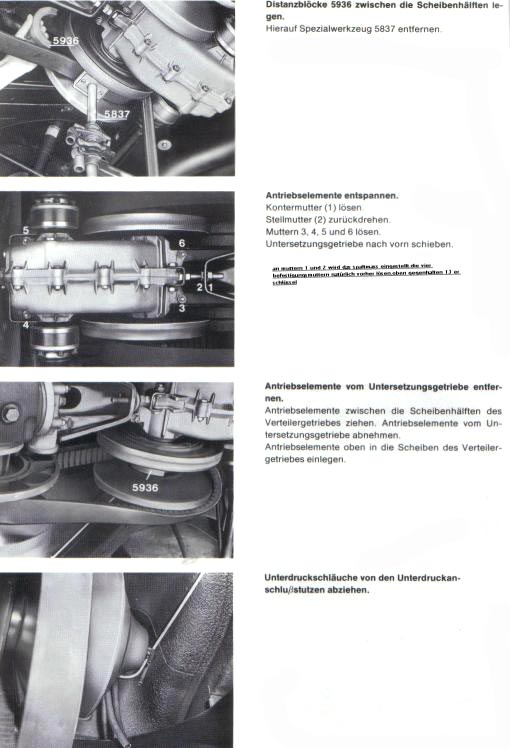 Dann mit Spezialwerkzeug die Sekundärriemenscheiben auseinander drücken und Distanzstück einlegen. Vorsicht mit den Fingern, die Scheiben schnappen zu wie eine Bärenfalle.